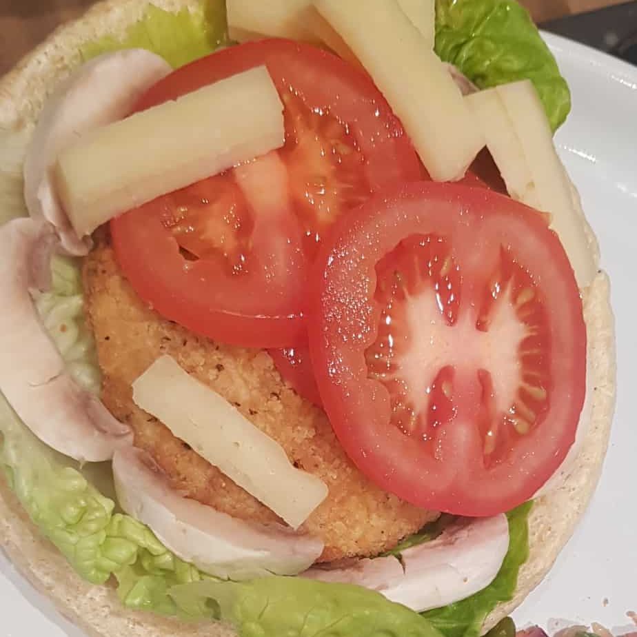 Cook your burgers according to packaging instructions I used Quorn southern fried burgers which take about 20 mins. While the burgers are cooking prep your burger ingredients, you can use anything you like in a burger, I used lettuce, tomato, mushrooms and cheese, you could even add your favourite sauce as well, once burgers are cooked grab any large Broghie and assemble. Guilt free burger